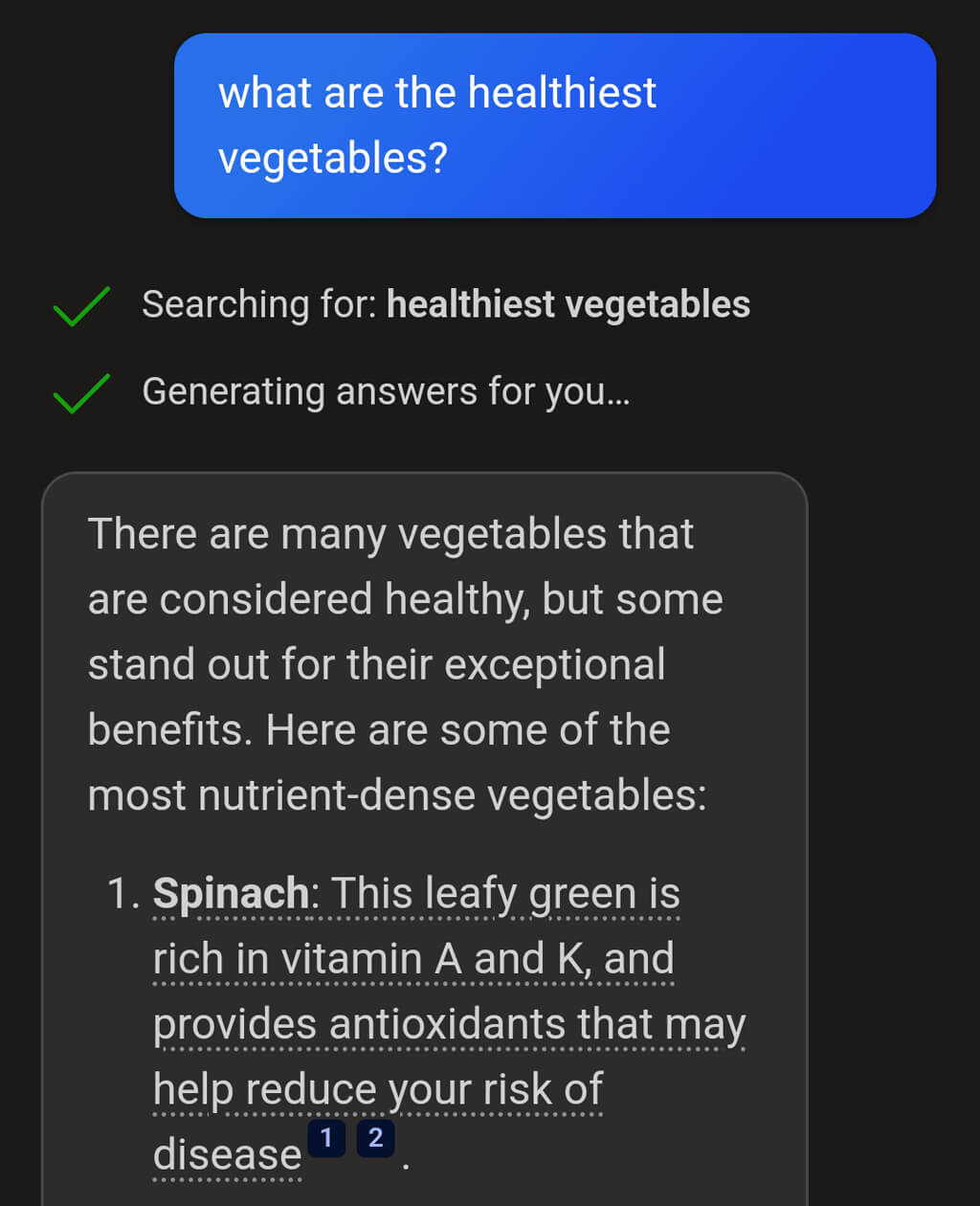 <img loading=“lazy” src=“https://www.online-tech-tips.com/wp-content/uploads/2024/03/how-to-install-and-use-microsoft-copilot-on-android-and-iphone-8-compressed.jpg" onerror=“this.onerror=null;this.src=‘https://blogger.googleusercontent.com/img/a/AVvXsEhe7F7TRXHtjiKvHb5vS7DmnxvpHiDyoYyYvm1nHB3Qp2_w3BnM6A2eq4v7FYxCC9bfZt3a9vIMtAYEKUiaDQbHMg-ViyGmRIj39MLp0bGFfgfYw1Dc9q_H-T0wiTm3l0Uq42dETrN9eC8aGJ9_IORZsxST1AcLR7np1koOfcc7tnHa4S8Mwz_xD9d0=s16000';" alt=“Copilot’s answer to the question, “What are the healthiest vegetables?” - 8”>