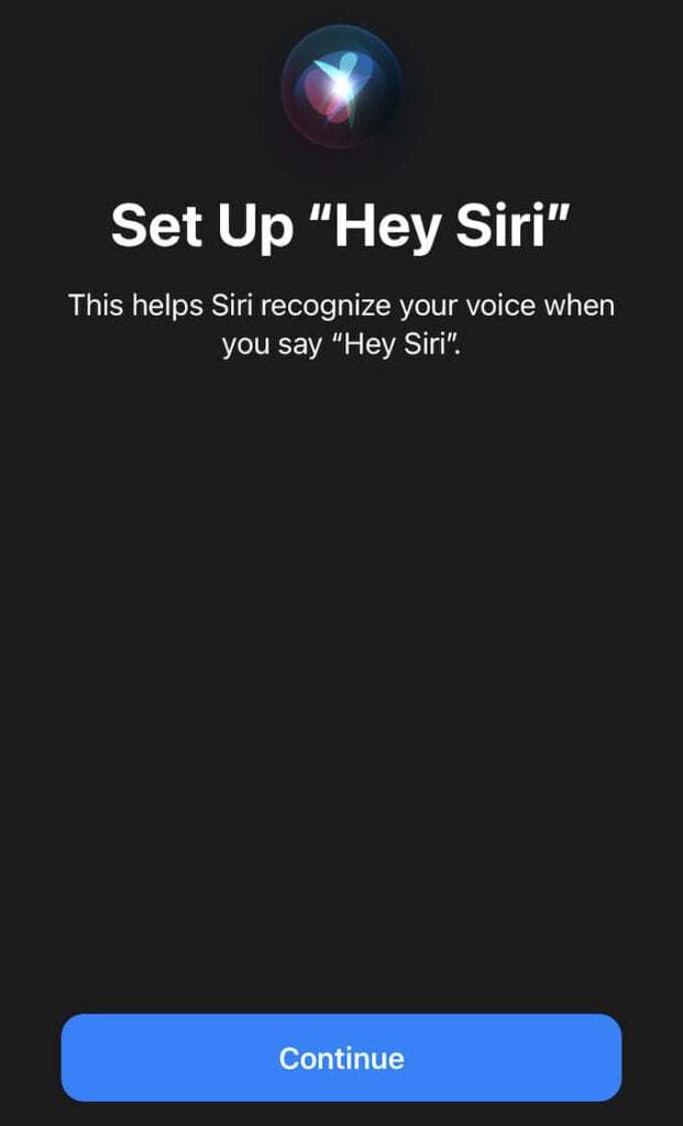 - The setup screen for Hey Siri will appear. Tap Continue.