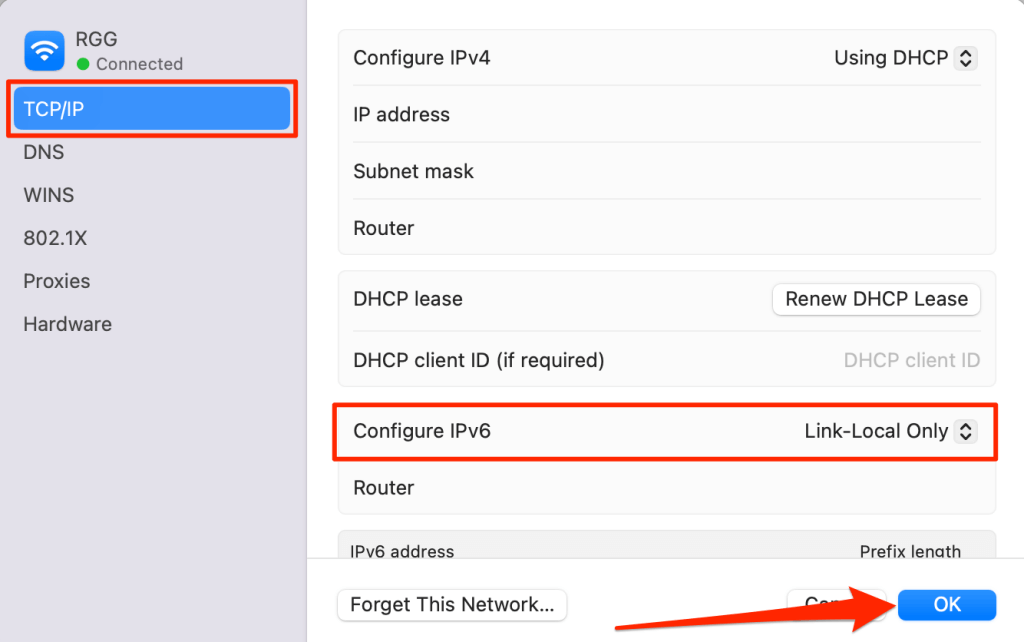 - Select TCP/IP on the sidebar, set “Configure IPv6” to Link-Local Only , and select OK .