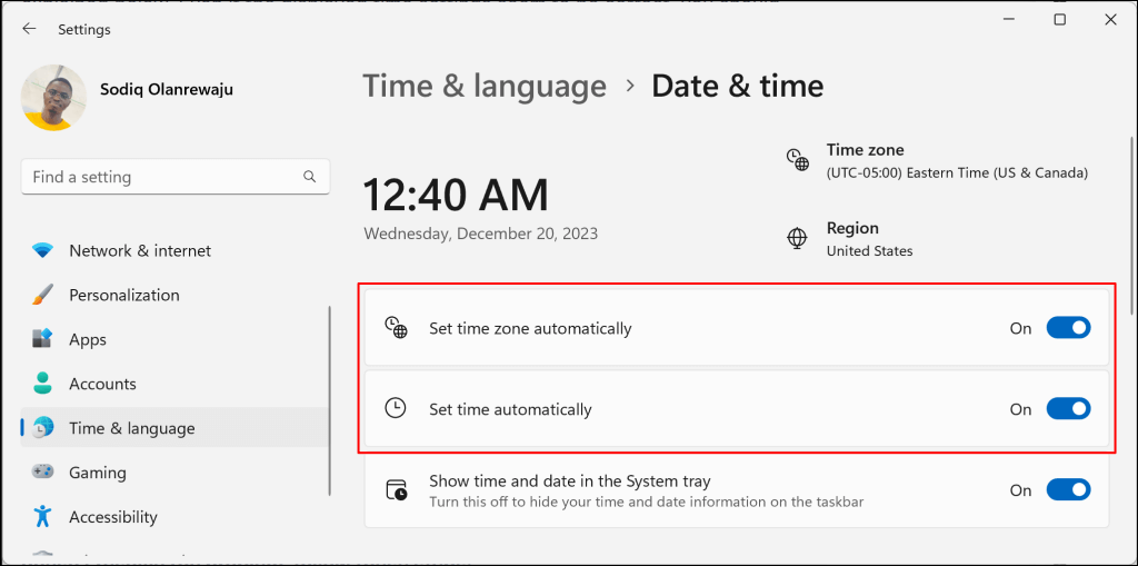 Go to Settings > Time & language > Date & time and toggle on Set time zone automatically and Set time automatically .