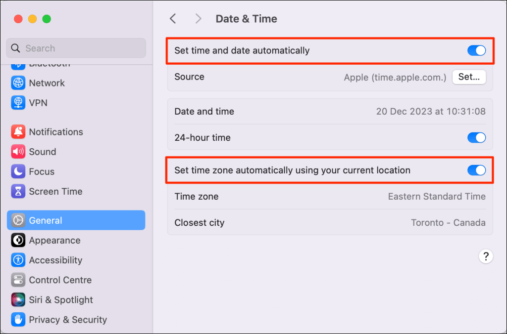 Go to System Settings > General and select Date & Time . Toggle on Set time and date automatically and Set time zone automatically using your current location .