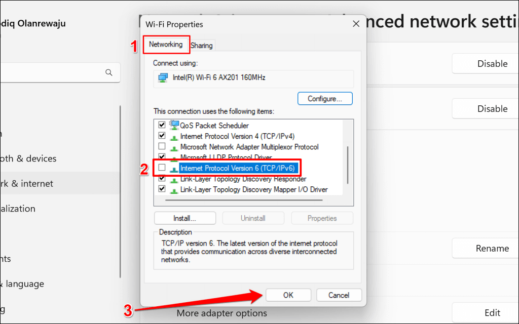 - Open the “Networking” tab, uncheck Internet Protocol Version 6 (TCP/IPv6) , and select OK .