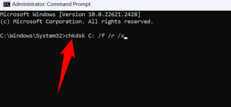 - Type the following command, replace C with the drive where you’ve installed Windows, and press Enter : chkdsk C: /f /r /x