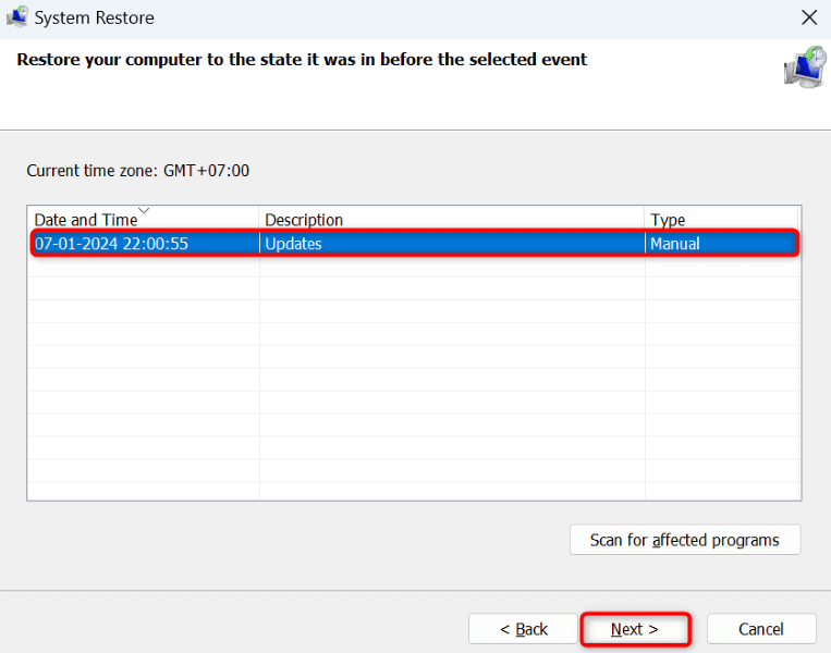 - Choose the most recent restore point on the list and select Next .